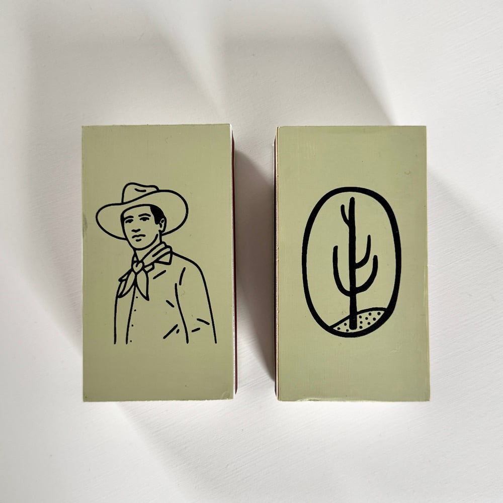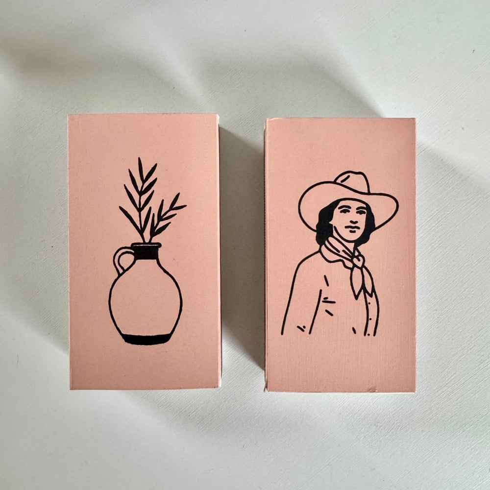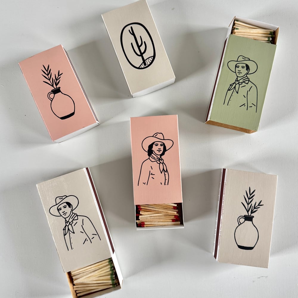 Two graphics per match box Cowgirl and vase together Or Cowboy and cacti together. Hand painted boxes, screen printed graphics. 250-300 matches per box.